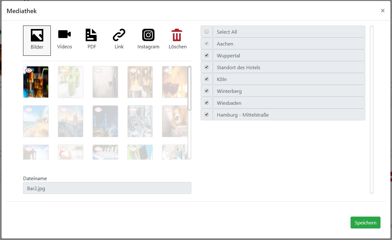 Die Share Content Mediathek, bietet Ihnen die Möglichkeit, hochgeladene Inhalte (Bilder, Videos, PDfs, Links) mit anderen Orten / Sites Ihres Accounts, zu teilen oder diese zu löschen und zu ändern.